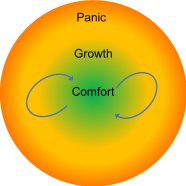 To explain a growth mindset to my team, I draw three concentric rings on a whiteboard or notepad (see below). I show the three levels of stress placed on an individual in their work environment. The ‘comfort zone‘ is where most people spend the majority of their time at work. The work may be complicated or complex, but it is not difficult, challenging or new. The ‘growth zone‘ is where a person needs to adapt and learn new skills, and while it is challenging and uncomfortable they can make progress. The ‘panic zone‘ is where the situation is so different or stressful that it is beyond a person’s ability to cope.